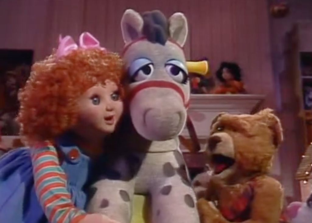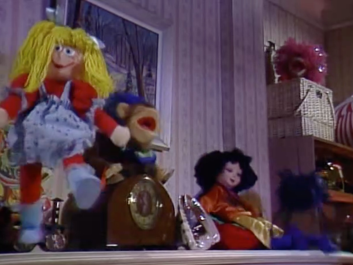 I always envied this playroom as a kid. I’ll bet Jesse got the castle with guards and Jamie got the giant dollhouse in the same year, because imagine one kid getting this huge amazing toy and the other getting anything even a little bit smaller—cue tantrum. And how the heck do those hot air balloon toys work? Actual hot air? A track on the ceiling? I mean both “how is the actual toy it’s imitating supposed to work?” and “how did the Henson workshop make their version work?”, which may be two different answers.
